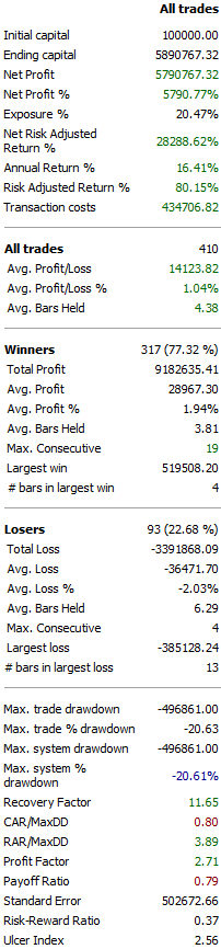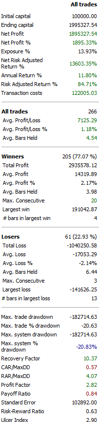 When combining all 3 strategies, we get the following equity curve and trading performance (statistics)