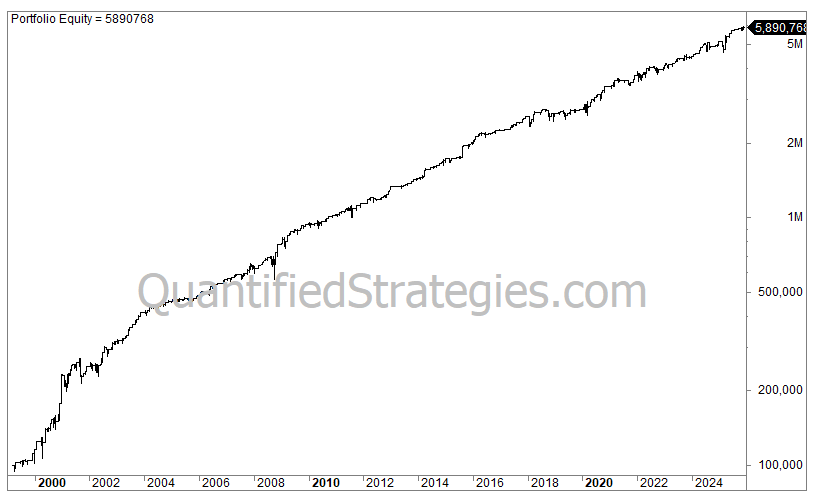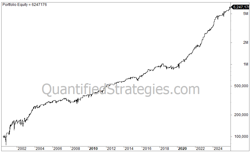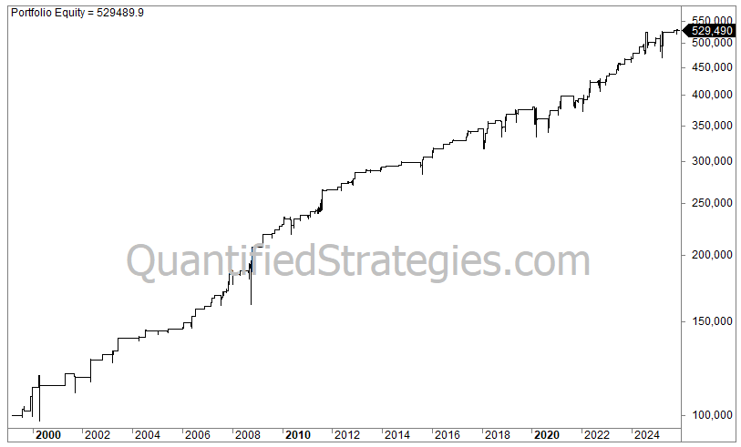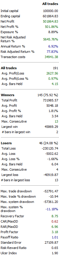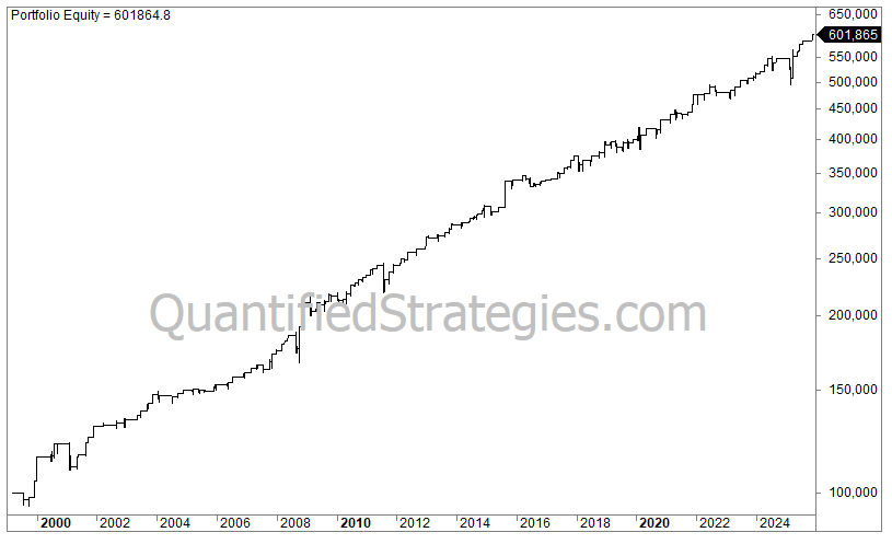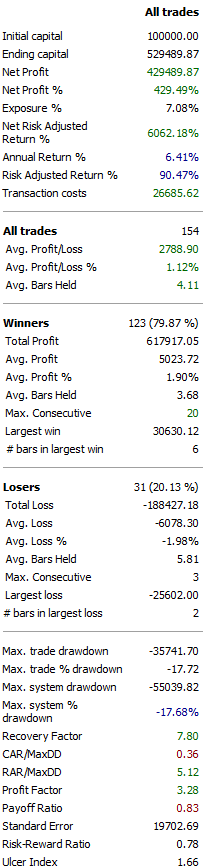 Buy and sell orders are backtested using the closing price (how to trade at the close – or alternative entries). No commissions and slippage included (estimated commissions and slippage).