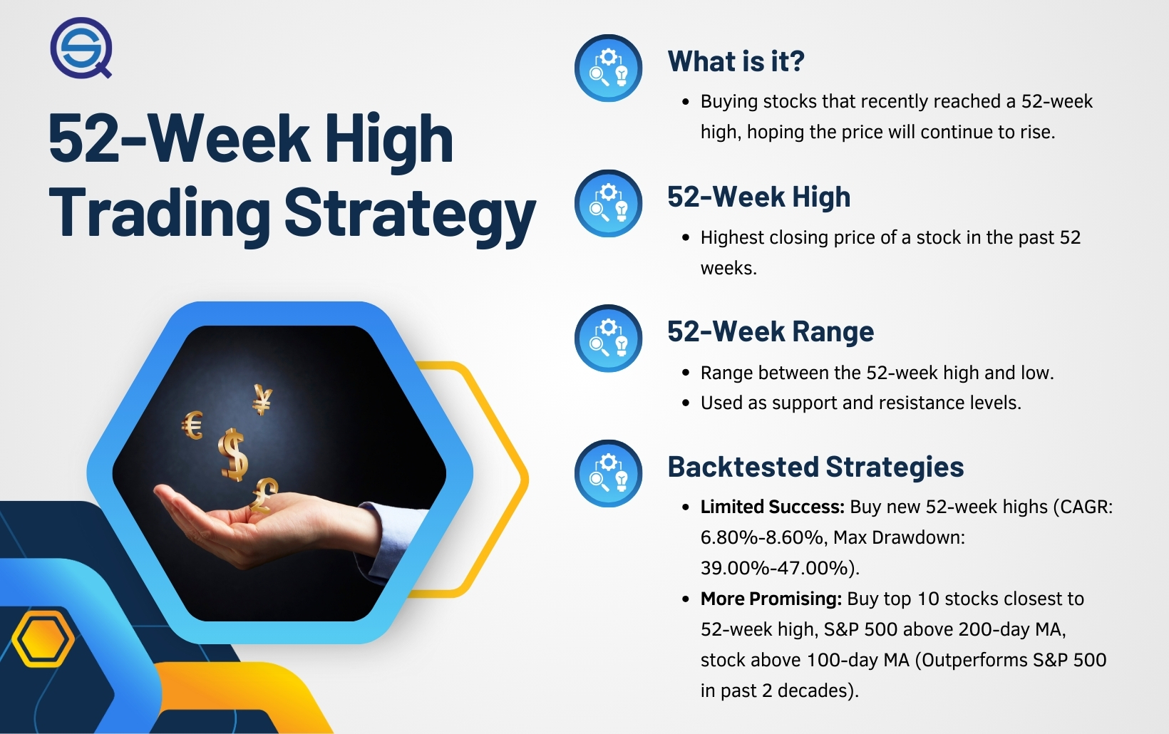 The 52-week high trading strategy is an investment approach that involves buying stocks that are trading close to their highest prices over a 52-week period. Contrary to the conventional “buy low, sell high” strategy, this method focuses on stocks near their 52-week highs, as they tend to outperform those trading far below. The 52-week high is determined by tracking the highest closing price of a stock over the past 52 weeks. It represents the peak value the stock has reached during a one-year period, providing insights into its recent performance.