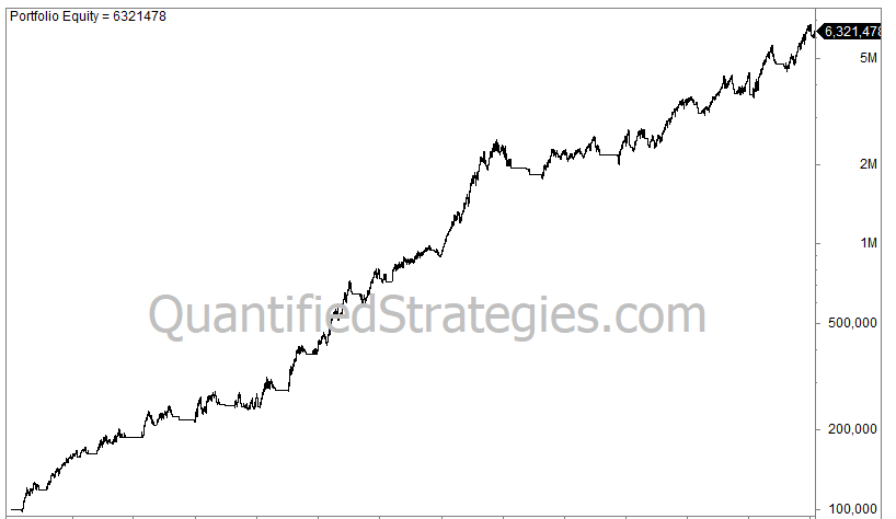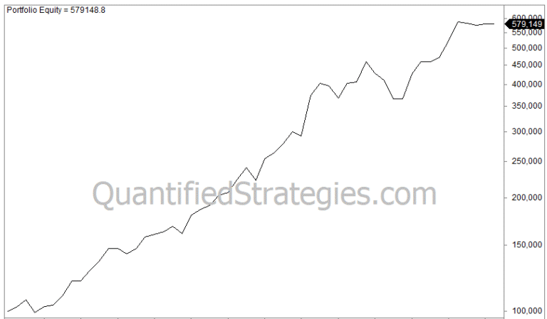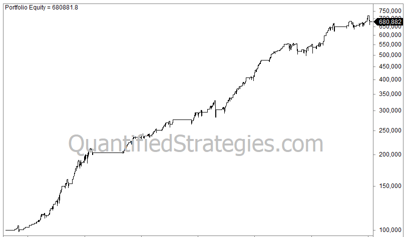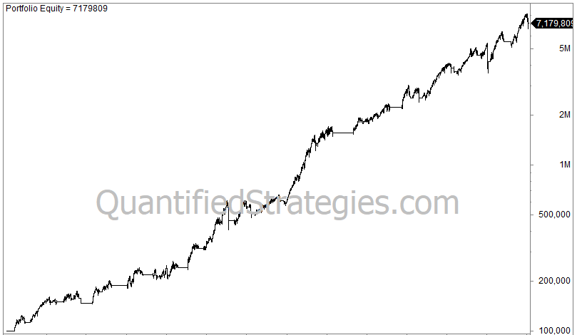 The starting capital of a hundred thousand grows to 1.2 million – a bit short compared to the first strategy -, but you experience a smoother ride with smaller losses.