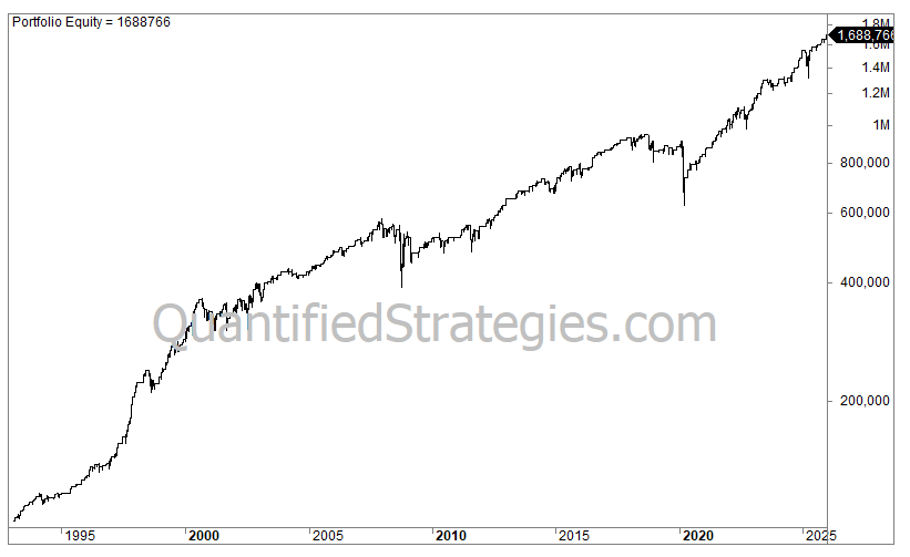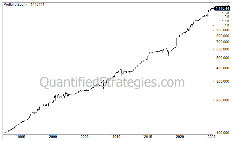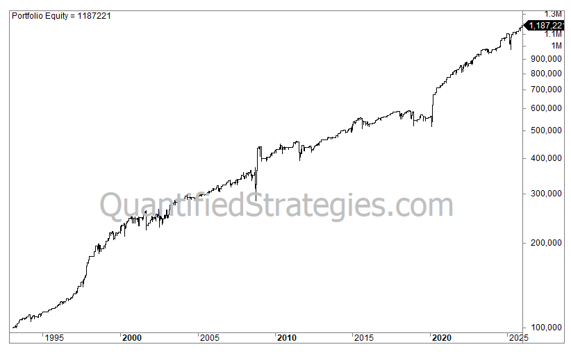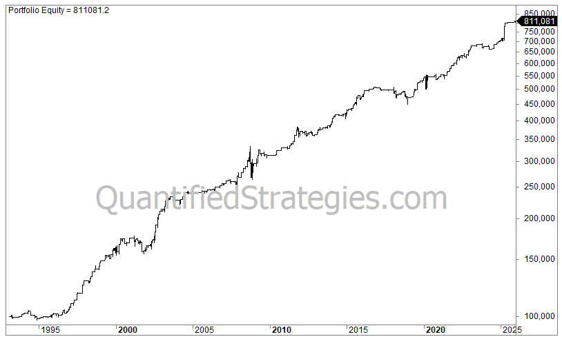 This very simple strategy has performed well. One hundred thousand invested in 1993 is worth eight hundred thousand today. The 0.6% gain per trade compounded at 6.5% annually, while being invested only 11% of the time. Max drawdown was 20%.