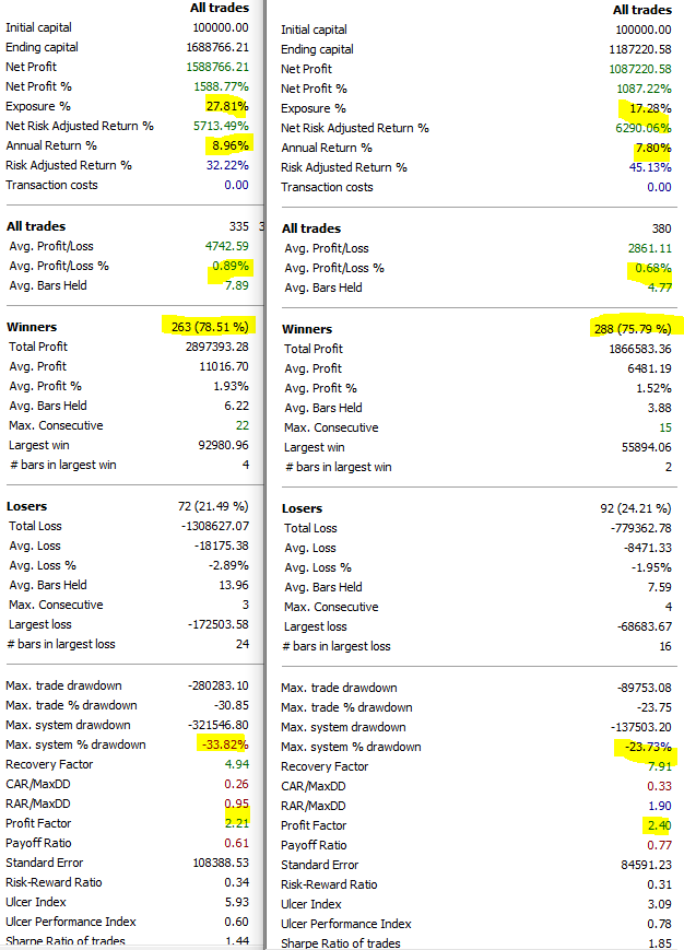 The second strategy spends 10% less time in the market and hence get a better risk-adjusted return. The performance metrics for the first strategy is on the left and the second is on the right side.