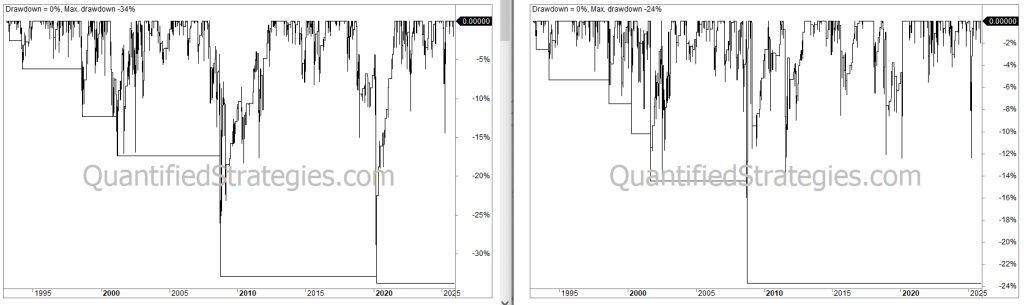 The drawdowns in the first strategy is on the left side, and the second strategy is on the right side. On the right side the losses are both smaller and shorter resulting in a better recovery factor, exactly what you are looking for in a trading strategy.