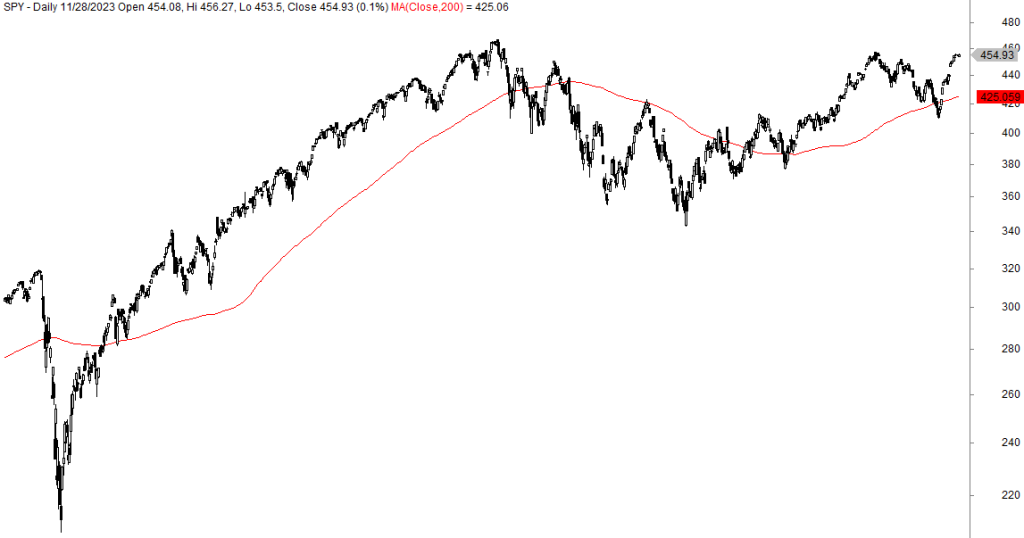 But let’s add the 200-day filter: we only trade if the price is above it. If the price is above it’s a bull market and we can enter during a pullback. If the price is below the average, we stay out.