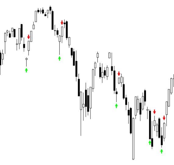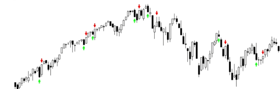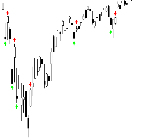 The green arrows mark Mondays when the market closes lower for the second consecutive day, while the red arrows indicate exits taken on strength. All five trades shown here are profitable, though trading inevitably includes losing trades as well.