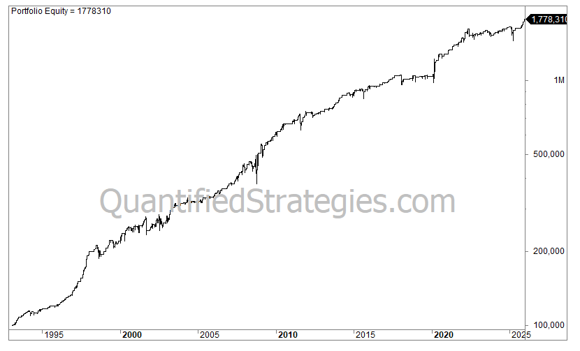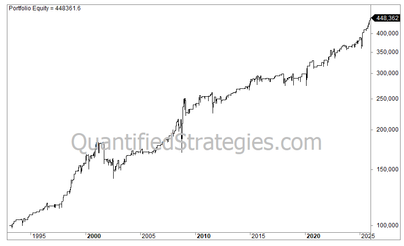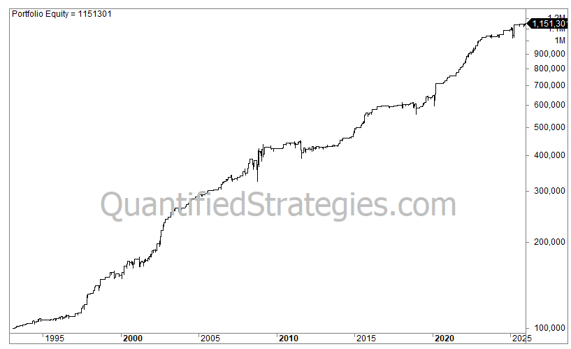 Now let’s step back and examine the broader picture by looking at the strategy’s equity curve from 1993 to today: