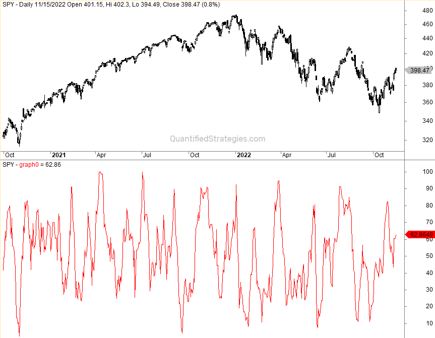 We want to sell on strength. The exit is when the close ends higher than yesterday’s high. This is QuantifiedStrategies.com’s exit trigger, which we developed 25 years ago.