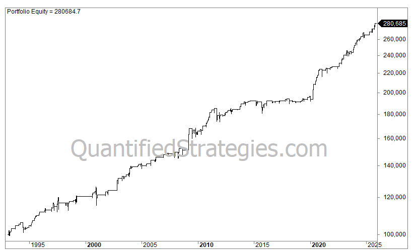 The equity curve shows a steady upward trend, bringing the total to 1.15 million. Not bad for such a simple strategy. There were 285 trades in total, with an average holding period of just 4 days, meaning the strategy is invested only 11% of the time, helping to avoid the largest drawdowns. The maximum drawdown is just 16%, and the risk-adjusted return is impressive at 69%.