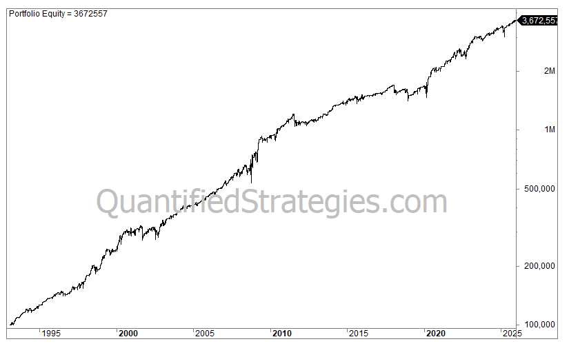 Starting with 100,000 in 1993, the strategy grows to 1.8 million today, even though it is invested only 17% of the time. The performance is impressive: with just 21% market exposure, it achieves a return comparable to buy-and-hold. By capitalizing on the market’s natural ups and downs, the strategy delivers a risk-adjusted return of 52%.