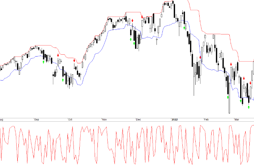 The red line in the chart represents the 10-day high. The blue line is derived by subtracting the average high–low range from the 10-day high. The lower panel displays the IBS indicator.