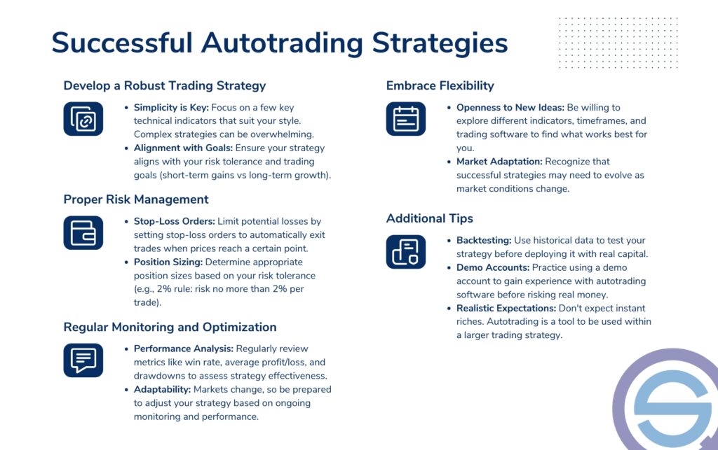 An infographic titled "Successful Autotrading Strategies" outlining key pillars for success: developing robust strategies, risk management, regular monitoring, flexibility, and additional tips like backtesting and demo accounts.
