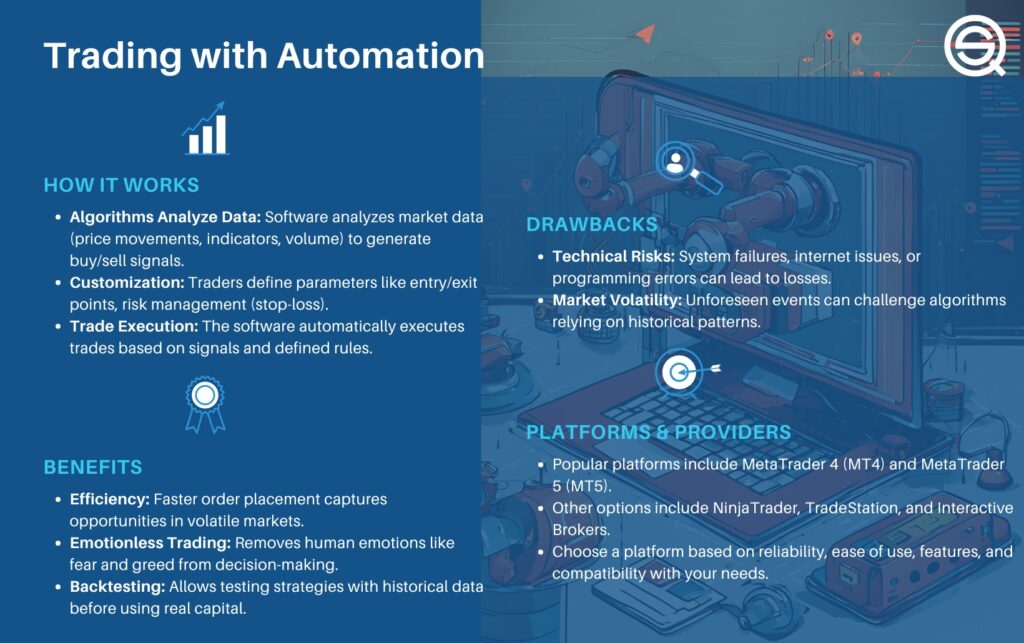 An infographic titled "Trading with Automation" explaining how it works, its benefits (efficiency, emotionless trading, backtesting), drawbacks (technical risks, market volatility), and popular platforms like MT4, MT5, and Interactive Brokers.
