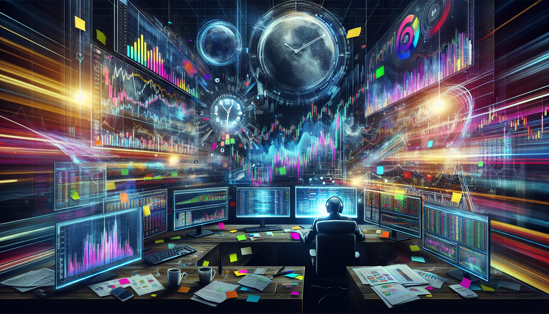 A high-tech digital workspace showing a trader surrounded by multiple monitors displaying real-time financial charts, glowing clocks representing global time zones, and vibrant data streams used for backtesting AI trading strategies.