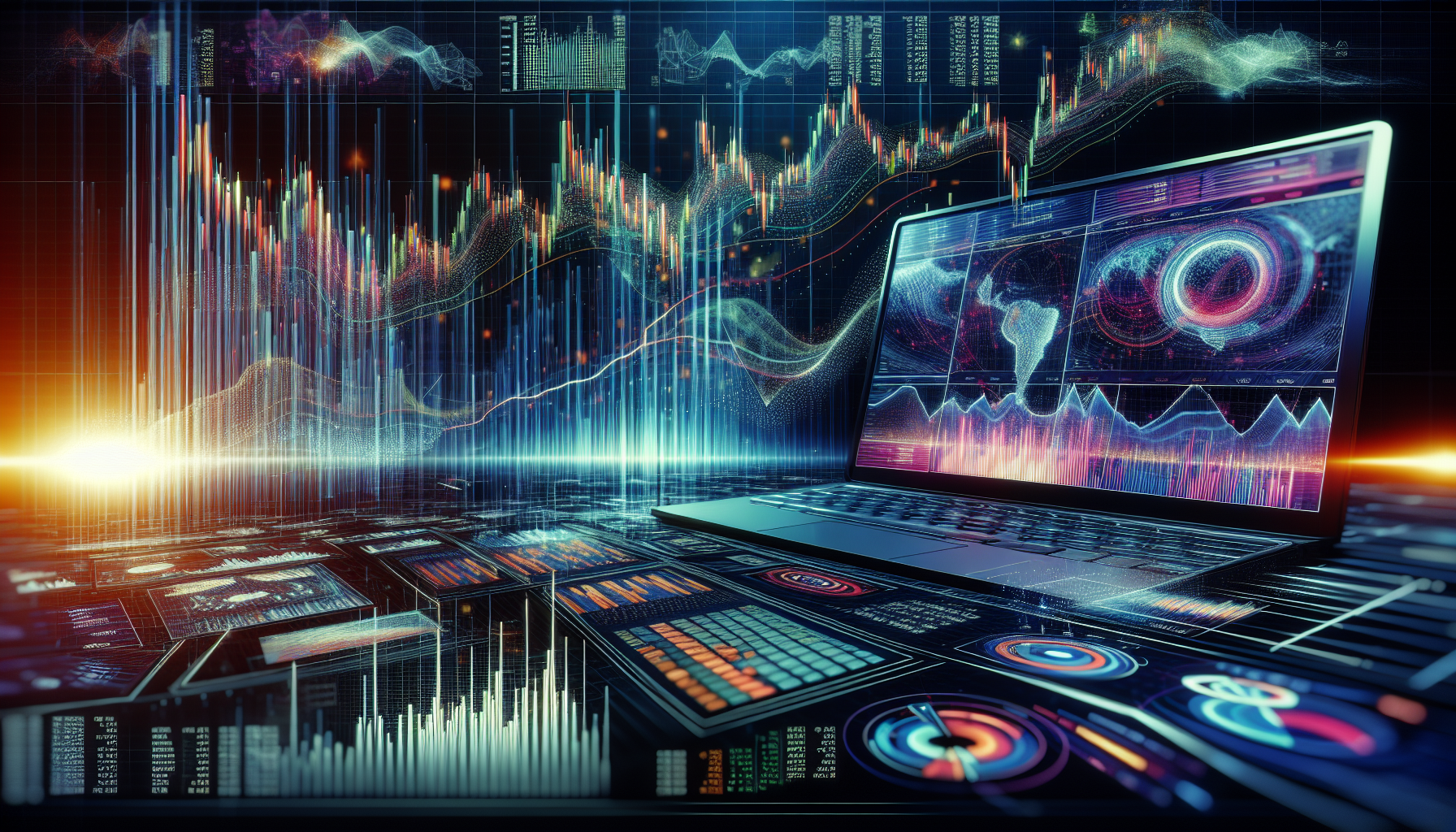 A high-tech digital visualization of a trading simulation featuring a laptop displaying global maps and charts, surrounded by glowing 3D financial data streams and vertical bar graphs on a dark grid.