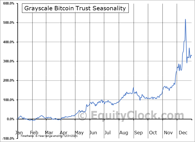 Both the Bitcoin futures market is new, so the seasonality charts are not easily available. However, there is a seasonality chart for Grayscale Bitcoin Trust. See it below: