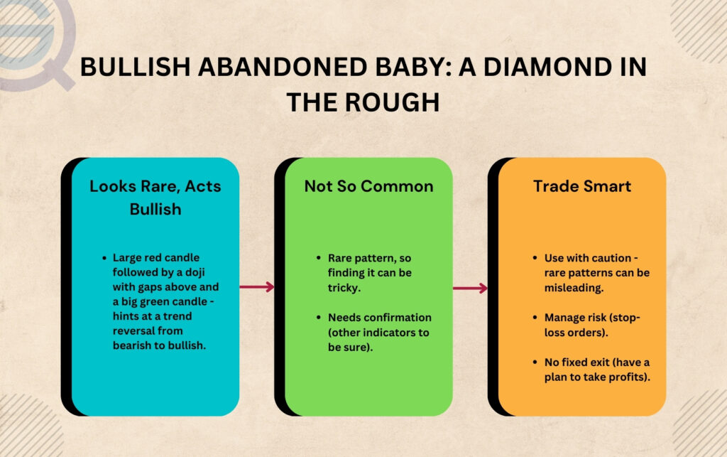 - Despite its effectiveness in signaling a bullish reversal, the Bullish Abandoned Baby pattern has limitations, such as its rarity due to strict formation criteria and the absence of a fixed profit target, necessitating the use of supplementary methods for profit-taking decisions.