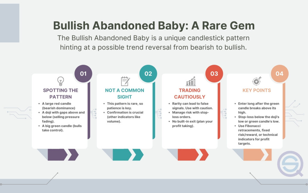 - The Bullish Abandoned Baby candlestick pattern is a rare and reliable reversal signal that suggests a potential shift from a bearish to a bullish trend, characterized by a sequence of a large red candle, a doji with gaps, and a large green candle.