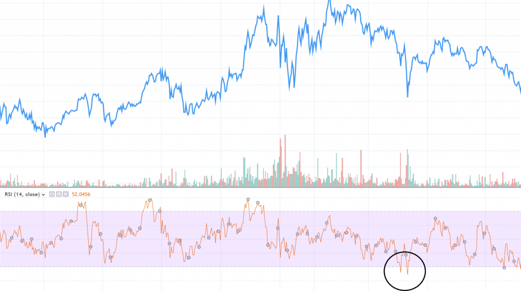 For a bullish breakaway to be worth acting on, it should appear in a negative short term trend, or after a price low swing. Put differently, the market should be oversold.Now, in order to measure when a market is oversold, we could use some trading indicators that serve this purpose. In this article, we won’t cover them all, since it simply would take too much time. Instead, we’ll look closer at our favorite indicator in this category, which is the RSI.RSI, or relative strength index, is a momentum oscillator that oscillates between 0 and 100, where readings above 70 are signs of an overbought market, while readings below 30 indicate an oversold market.In other words, you may way want to take a bullish breakaway signal only if the market is showing RSI readings of 30 or lower.If you’re interested in learning more about the RSI and its applications, we recommend that you read our complete guide to the RSI.