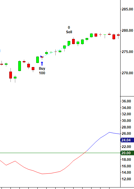 Now, we exit the trade if the position crosses under the 10-period moving average. In other words, we’re using a sort of trailing stop.