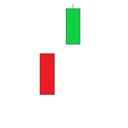 - The pattern starts with a bearish (red/black) candleThe second candle gaps to the upside, and opens above the previous day’s close. It continues straight up and ends as a bullish candlestick. The gap should not be filled by the wick of the second candlestick, but be left untouched. In other words, the candlestick has a tiny or nonexisting lower wick.