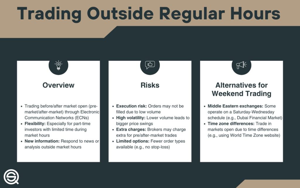 An infographic titled "Trading Outside Regular Hours" detailing the overview, risks, and weekend alternatives, including ECNs, high volatility, and Middle Eastern exchanges like the Dubai Financial Market.