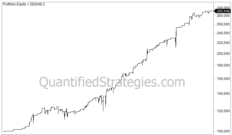 The only condition we used is that at least one day of the last two days must be a down day (including the doji), and the IBS indicator must be below 0.5. For additional confirmation, a bullish candle or bearish candle following a doji can provide further evidence of a possible reversal. We sell when the close ends higher than yesterday’s high. Here is the result: