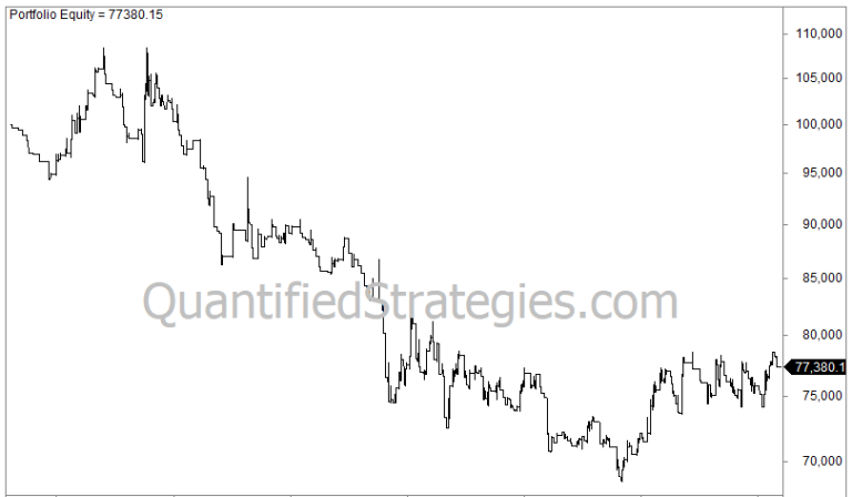 What if we turn it upside down? The IBS indicator must be higher than 0.8, and the close must be above the 10-day average. We cover when the close ends lower than yesterday’s close. If a bearish candle follows a doji, this combination can signal a possible reversal or price reversal, indicating that bearish pressure may be increasing.