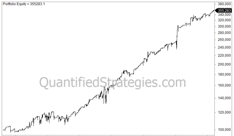 The only condition we used is that at least one day of the last two days must be a down day (including the doji), and the IBS indicator must be below 0.5. For additional confirmation, a bullish candle or bearish candle following a doji can provide further evidence of a possible reversal. We sell when the close ends higher than yesterday’s high.
