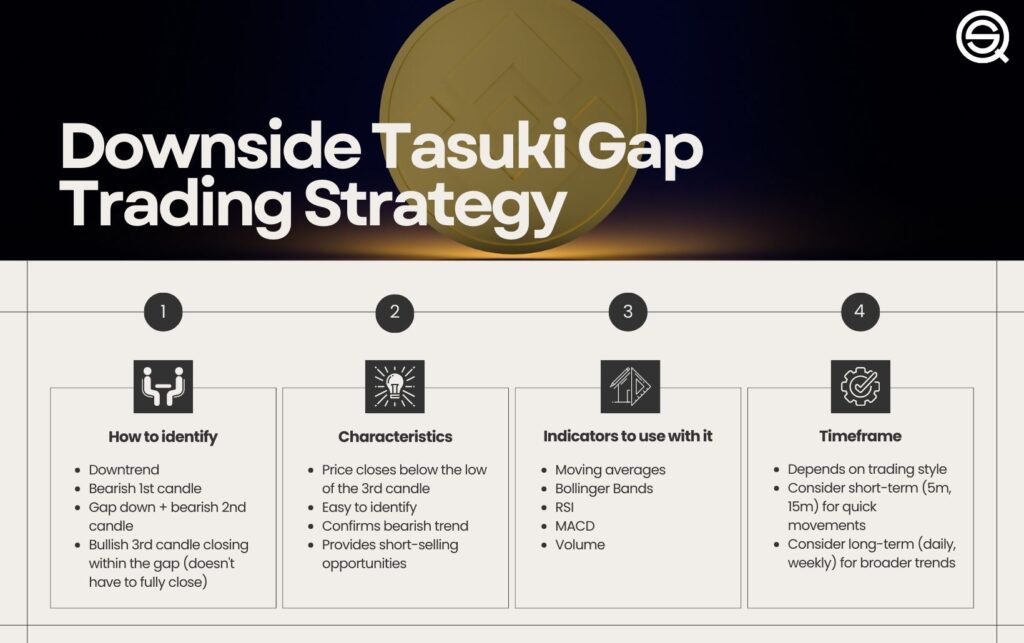 Traders should look for a downtrend, a bearish first candle, a gap down with another bearish candle, and a bullish third candle closing within the gap. Traders may use moving averages, Bollinger Bands, RSI, MACD, and volume to support their Downside Tasuki Gap trades and gain additional insights.