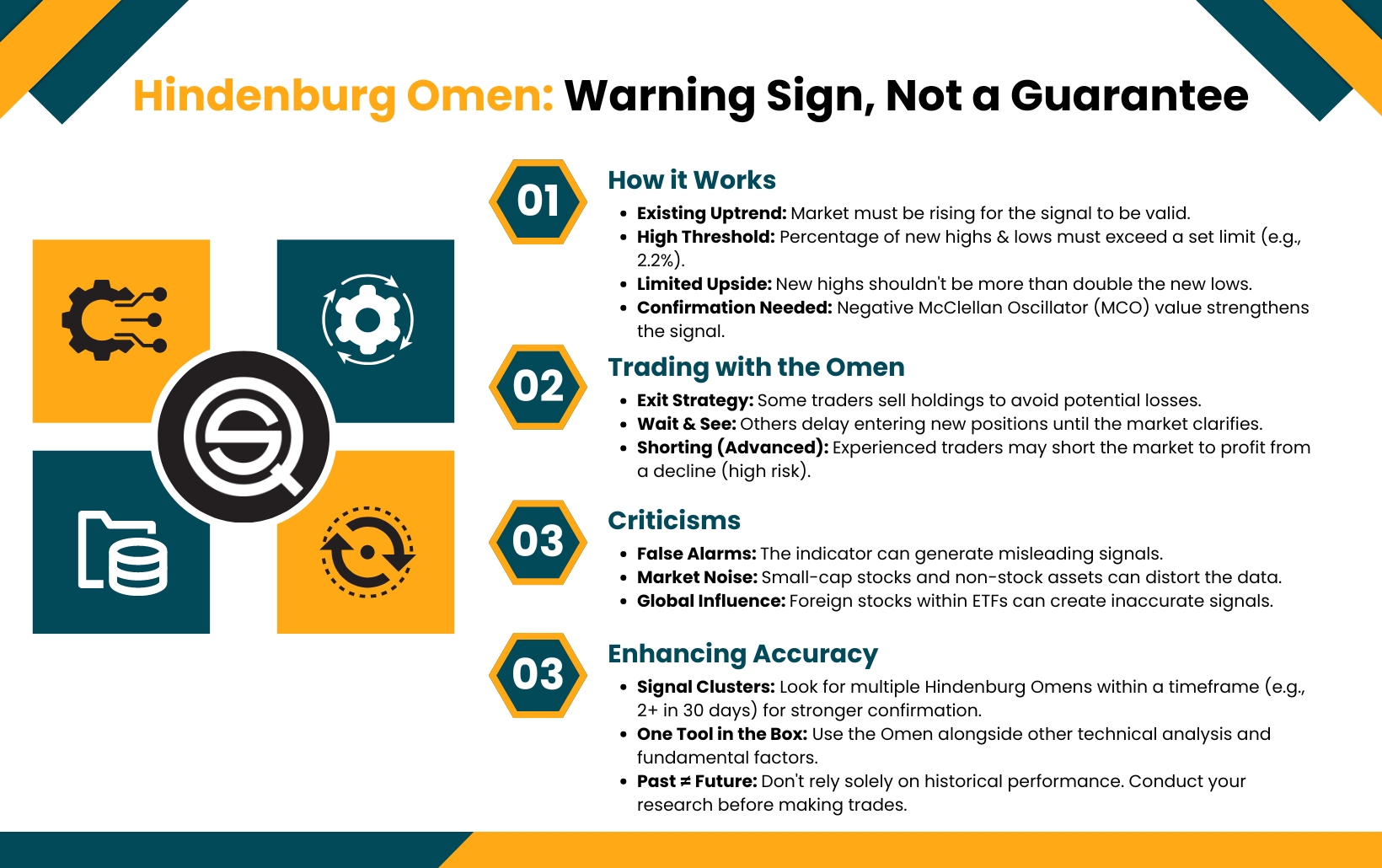 The Hindenburg Omen is not designed as a complete strategy. It doesn’t provide entries, exits, position sizing, or risk-management rules. It only indicates elevated risk. Many traders mistakenly treat it as a predictive system when it is fundamentally a diagnostic tool.