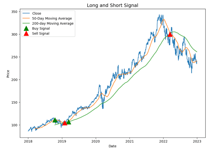 A technical analysis price chart from 2018 to 2023 showing a price line with 50-day and 200-day moving averages, featuring green triangles for buy signals and red triangles for sell signals.