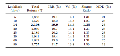 The authors used a lockback period of 14 days. However, they provided a table showing that a wide range of lookback periods were profitable.