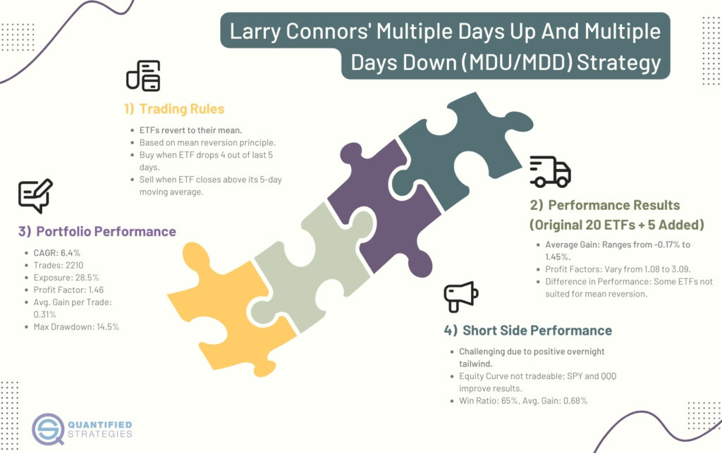 An infographic puzzle titled "Larry Connors' Multiple Days Up And Multiple Days Down (MDU/MDD) Strategy" covering trading rules, performance results, portfolio metrics, and short-side performance.