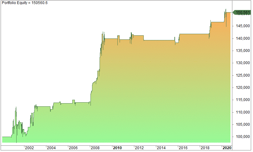 A long-term portfolio equity curve graph showing growth from $100,000 in 2002 to a final portfolio value of $150,560.60 in 2020.