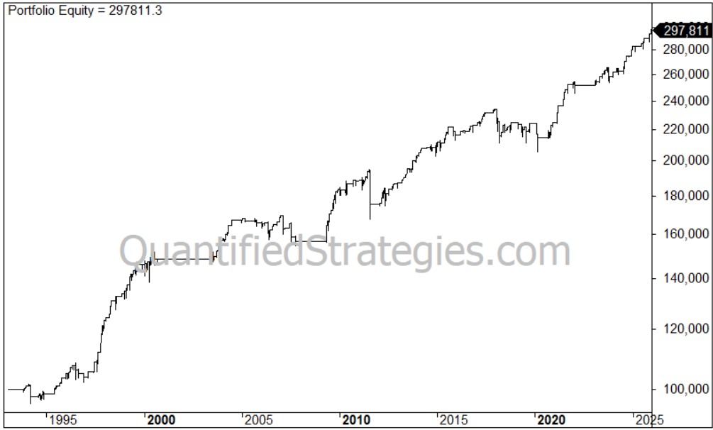 A line graph titled "Portfolio Equity = 297811.3" showing the long-term equity growth of a strategy traded in SPY from 1993 to 2025, with a final portfolio value of $297,811.
