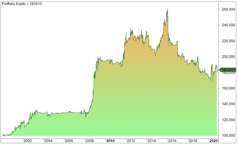 A long-term portfolio equity curve graph showing consistent growth from approximately $100,000 in 2002 to over $368,000 by 2020.