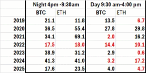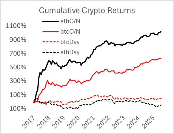 - Crypto overnight returns dominate total returns: Bitcoin and Ethereum generate +48 vs -2 basis points during overnight vs intraday periods