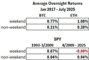 One of the most striking aspects of the crypto overnight anomaly is its amplification during weekends – the weekend effect. Weekend overnight returns generate 3-4 times the returns of weekday overnight periods.