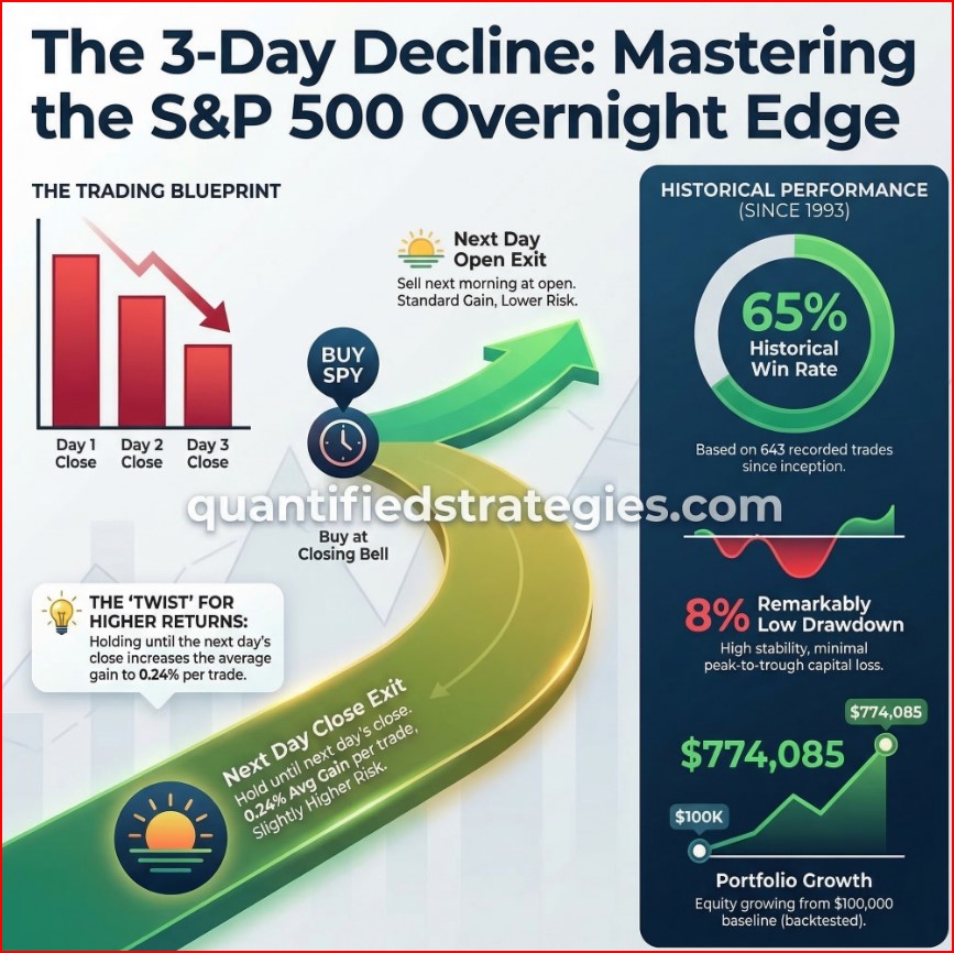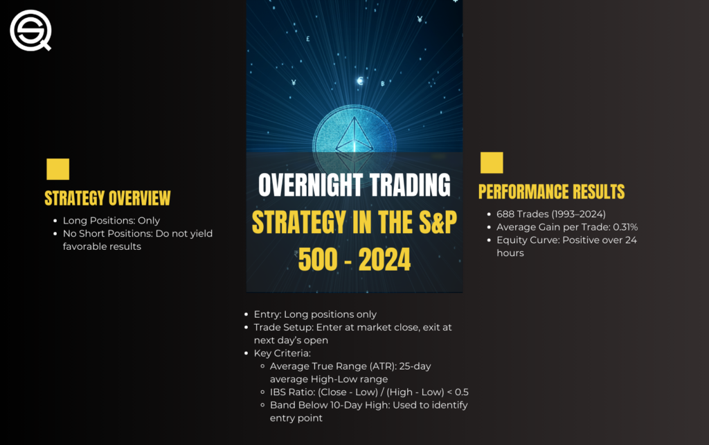 An overnight trading strategy involves entering a trade at the market’s close and exiting it at the following day’s open. In the case of the S&P 500, this strategy uses specific criteria, such as Average True Range (ATR) and the IBS ratio, to determine entry and exit points.