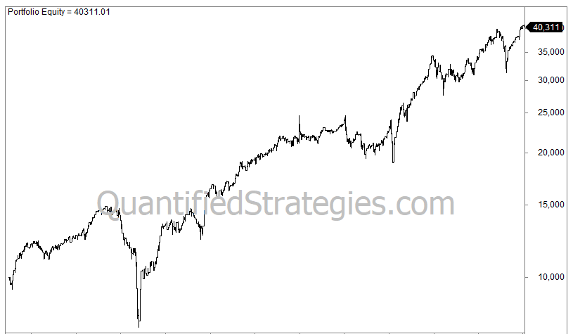 Our first backtest is done in stocks (S&P 500 – SPY). The equity curve looks like this: