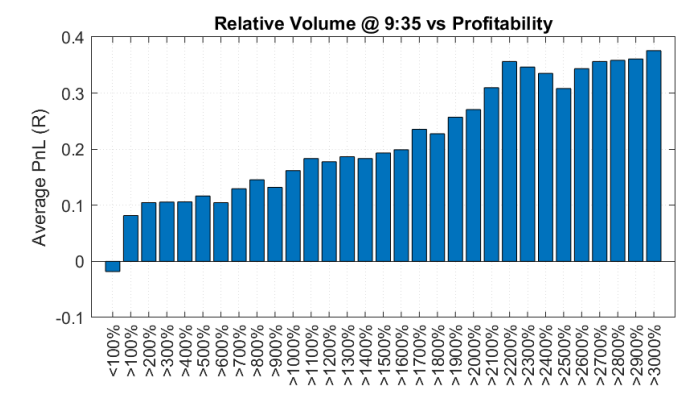 When Relative Volume was below 100% (average activity), the PnL averaged -0.02R (meaning a net loss). When Relative Volume exceeded 100%, the PnL improved significantly to 0.08R per trade. Remarkably, for stocks exhibiting activity over 30x (3,000%), the average profitability soared to 0.38R per trad
