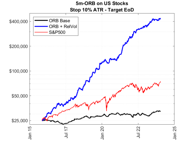 The performance improvement achieved by the ORB + Relative Volume strategy was extraordinary.