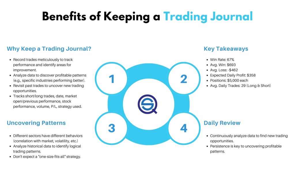 Your trading journal should include details like the type of trade (short/long), the day of the week, trade date, market open, previous market and stock performance, average volume, profit or loss (P/L), and the strategy used.