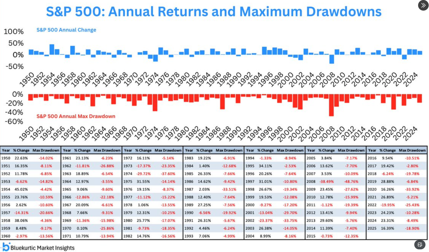 Below is a chart showing annual maximum drawdowns of the S&P 500 from 1950 through 2025. The chart highlights the frequency of significant intra-year declines and their year-to-year variability.