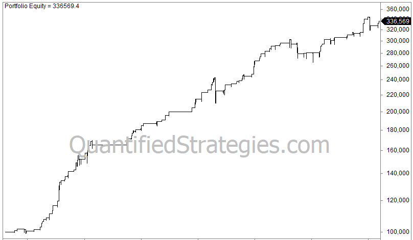 The 103 trades since 1993 are few, but the average gain is a solid 1.2% per trade. The win rate is 90%, and the profit factor is 4. It is a trading strategy with a high win rate. In a previous article, we argued the win rate is an underappreciated trading metric because a low win rate in most cases leads to behavioral trading mistakes – biases.