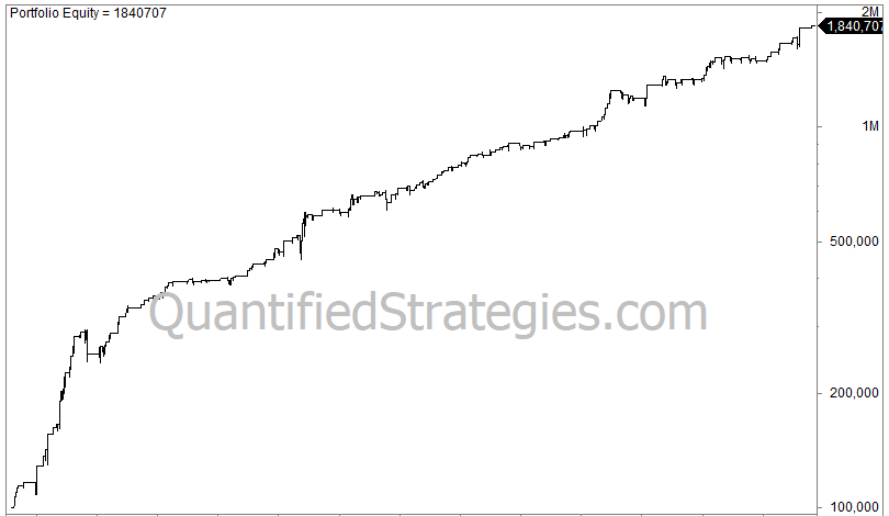 Despite a low trade number of only 225, the CAGR is a solid 11.5% due to the high average gain per trade of 1.3%. Max drawdown is 18%.