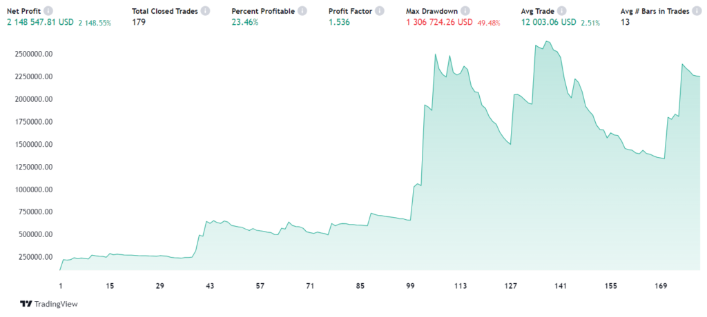 This best trading strategy for crypto chart demonstrates how a short-term trend-following approach on Bitcoin generated over $2.1 million in net profit, maintaining a profit factor of 1.536 despite a low win rate.