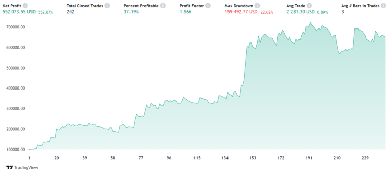 This best trading strategy for crypto backtest highlights the power of momentum, turning a $100,000 starting balance into over $652,000 through 242 closed trades while maintaining a manageable maximum drawdown of 22.02%.