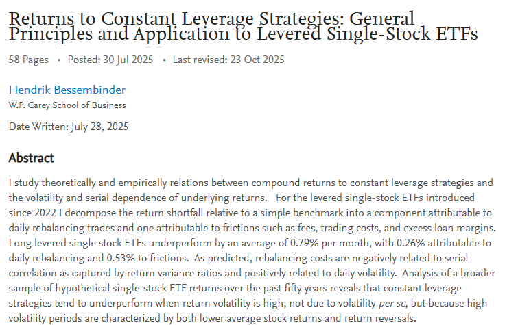 In a recent research paper titled “Returns to Constant Leverage Strategies: General Principles and Application to Levered Single-Stock ETFs,” Professor Hendrik Bessembinder of Arizona State University provides a deep dive into the mechanics and risks of the rapidly growing levered single-stock ETF (LSS-ETF) market.